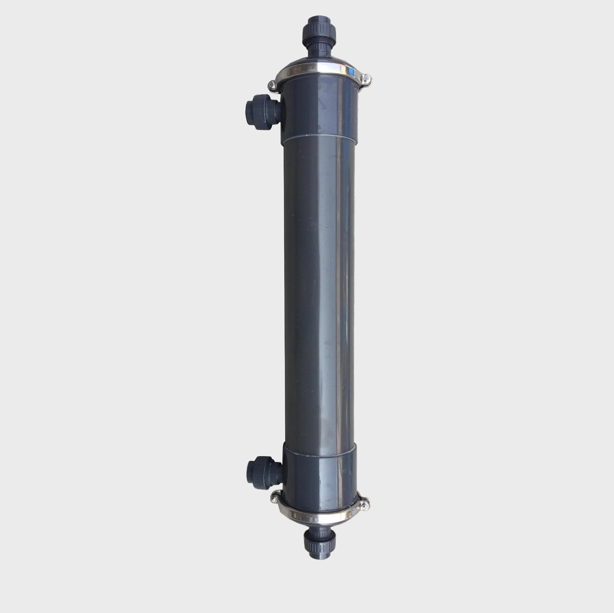 本產品為外壓式超濾膜,根據膜組件外壁的箭頭方向, 箭頭指向的端口是超濾透過液出液口,下部是電泳漆原液進液口,側面上面的口為電泳漆回流口,側面下面的口可以堵住不用;在電泳漆使用過程中可以使用水沖洗,超濾透過液沖洗,沖洗時從膜的回流口進入,原液進入口排出即可。當沖洗效果不是很好時,可以用有機酸和溶劑浸泡,循環沖洗清除膜中的油漆,從面恢復膜的通量。
